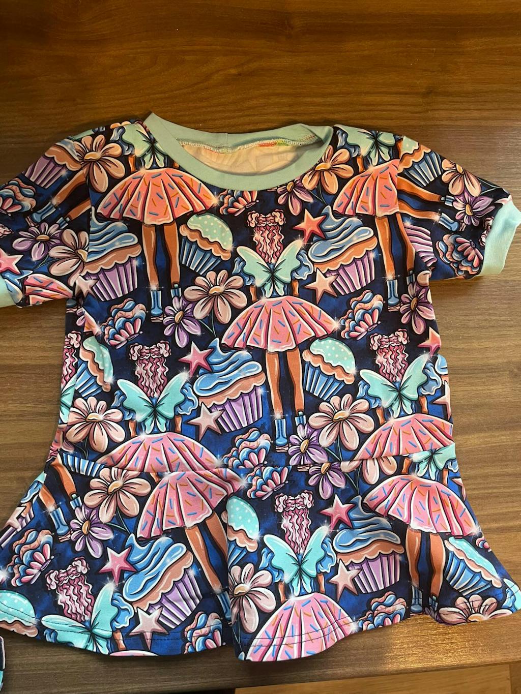 When I opened the parcel and saw the most beautiful print I was in shock , it is absolutely beautiful, from the colour to the little cupcakes I’m still amazed by this print but also how beautiful it is being made into a peplum top , thank you so much , it’s the perfect fairy girly addition to my little one’s wardrobe , I will be a customer for life :) one of a kind customer service