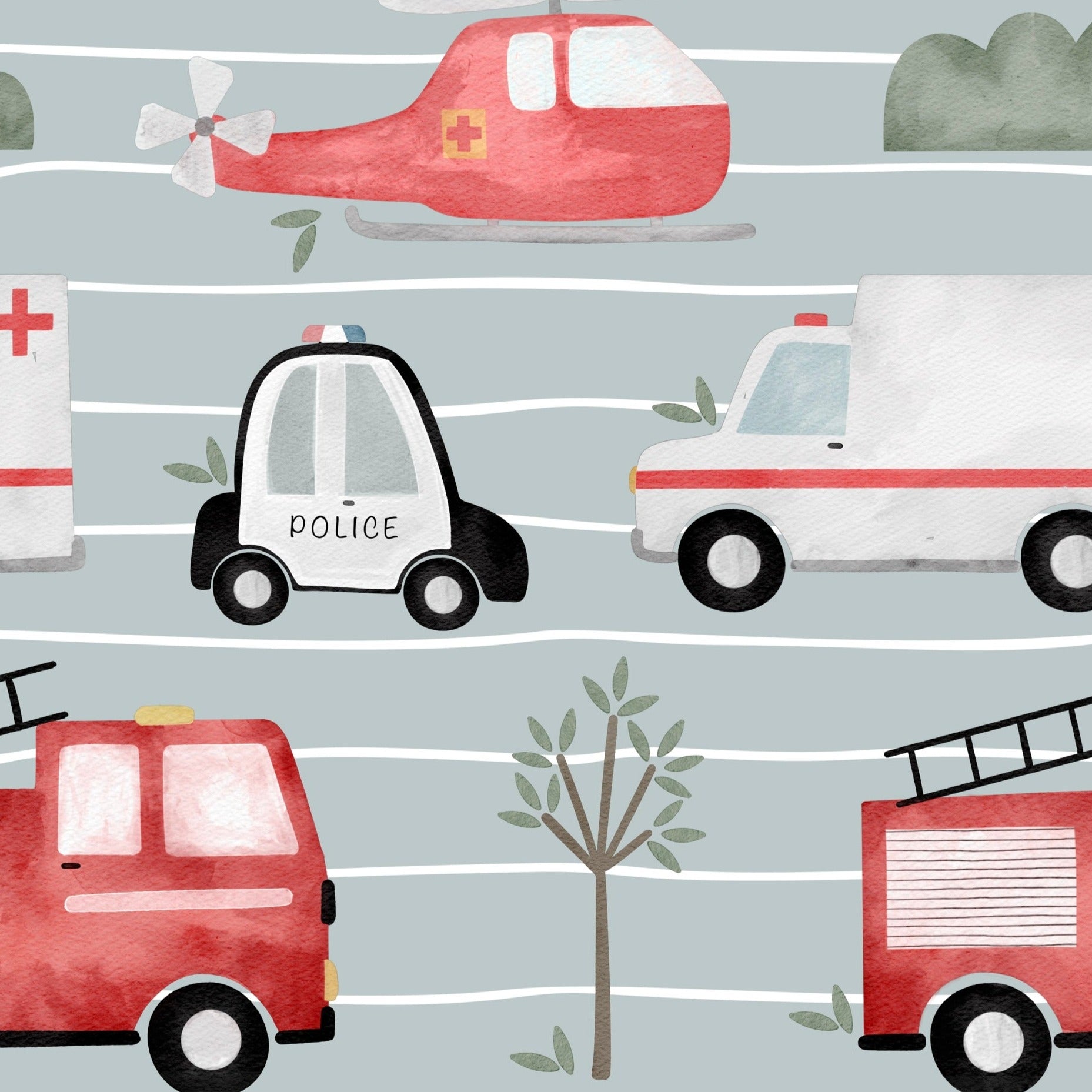 Fire engines, Police cars, Ambulances, Helicopters... this print has it all.