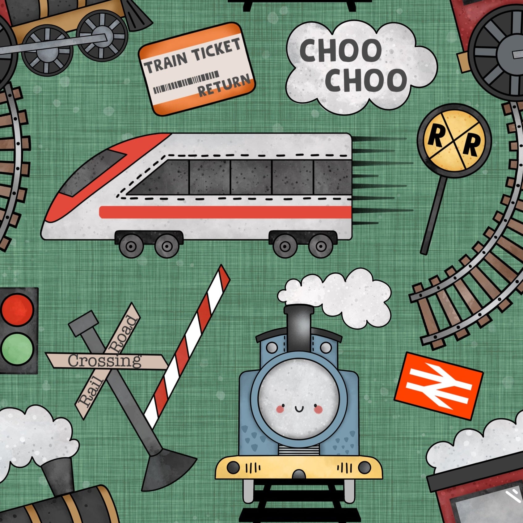 This fun design has everything your engine enthusiast could want. Trains, Tickets, Tracks and signals!